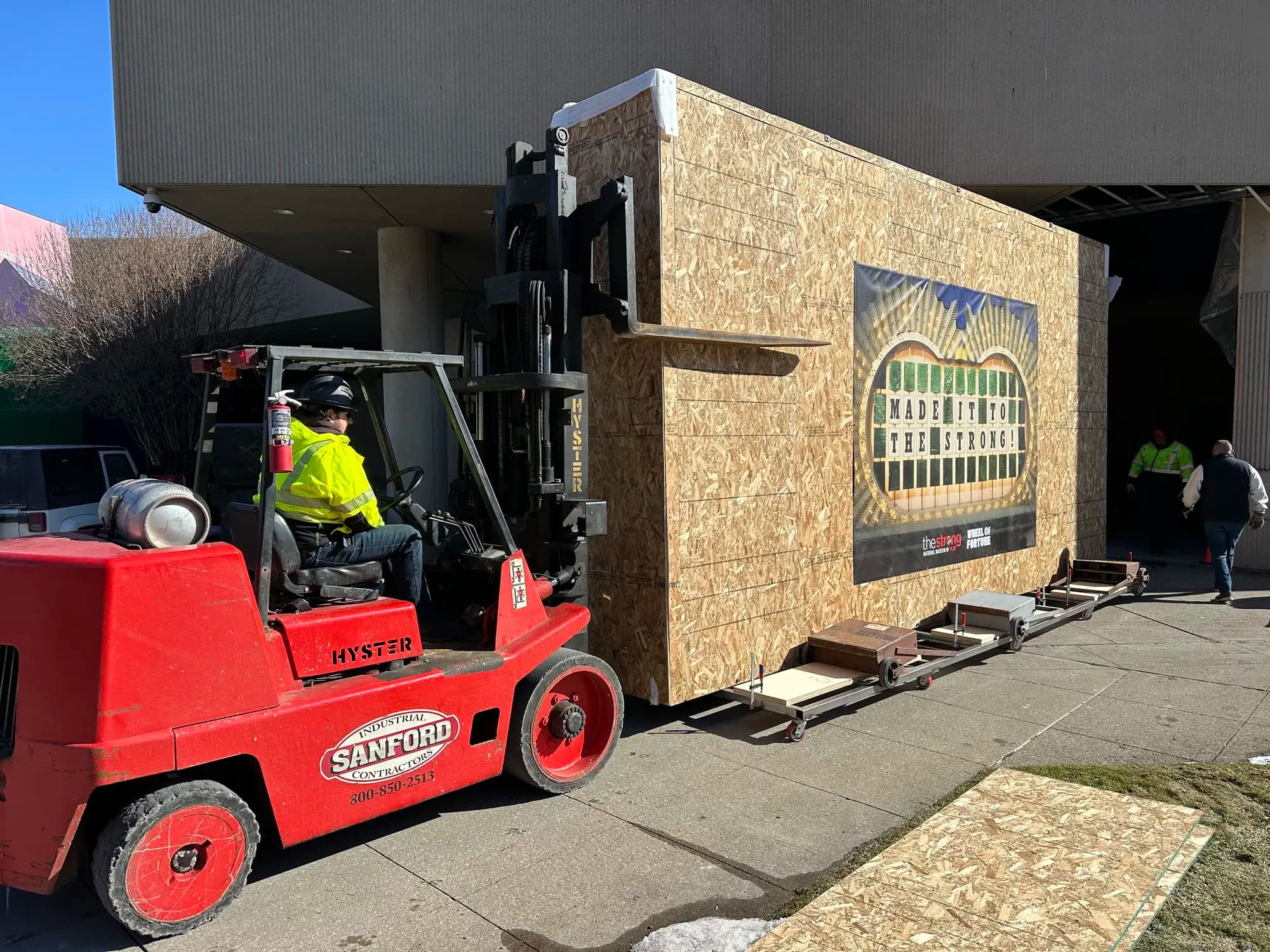 The Strong National Museum of Play in Rochester acquired the original Wheel of Fortune puzzle board from NBC Studios in Los Angeles for their new game show exhibit. Sanford Industrial Contractors was brought in to rig the oversized board into the building, which required removing a precast wall section from the museum to get it into position.